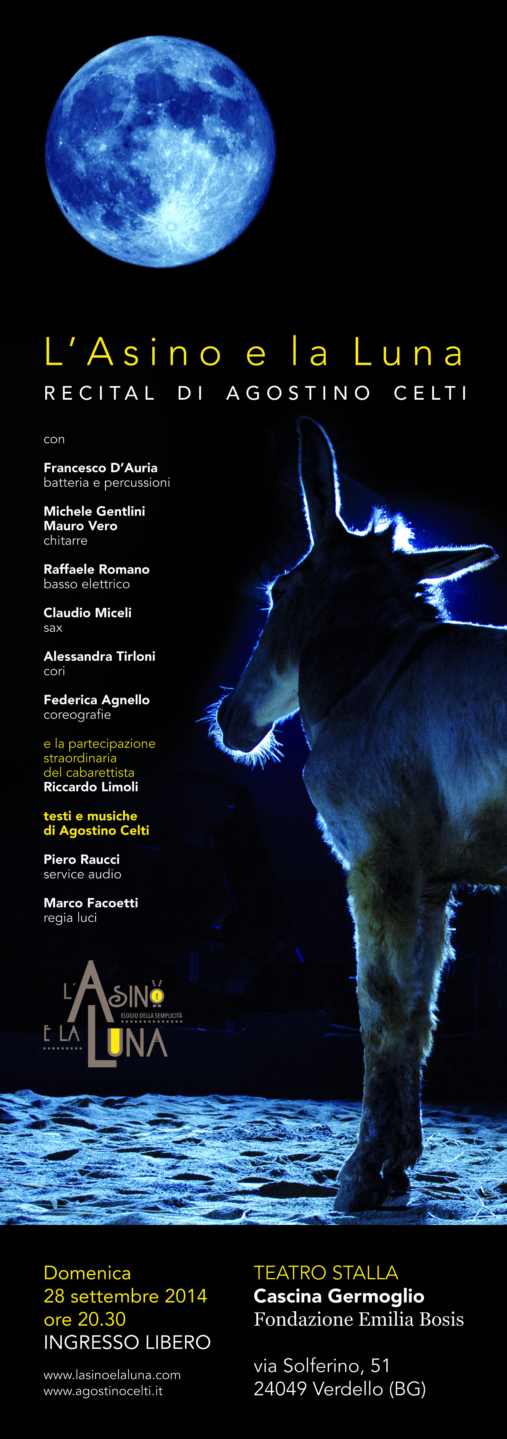 L'asino e la luna - locDomenica 28 Settembre alle 20.30, presso il Teatro Stalla di Cascina Germoglio (una delle tre strutture della Fondazione Emilia Bosis di Bergamo), si terrà il concerto del cantautore milanese Agostino Celti, autore del brano “L’asino e la luna”. L’evento musicale conclude la prima fase dell’omonimo progetto, che ha come slogan “Elogio della semplicità” ed ha ispirato il Primo Simposio Internazionale d’Arte Contemporanea, tenutosi a Cascina Germoglio.